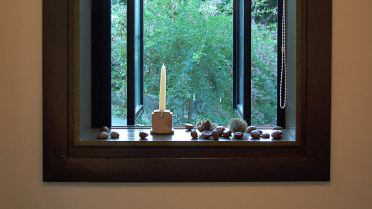 座間にある古民家を利用したギャラリー母屋。友人に誘われてガラスやテキスタイルの作家たち4〜5人でのグループ展に出品した。写真は庭に落ちていた栗とキャンドルスタンドを窓辺に展示したもの。キャンドルスタンドやランプが多かった。