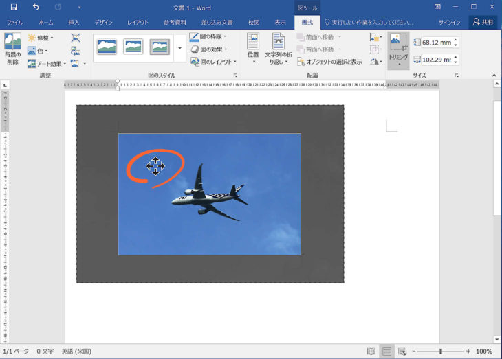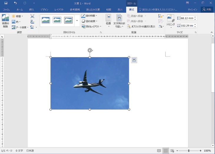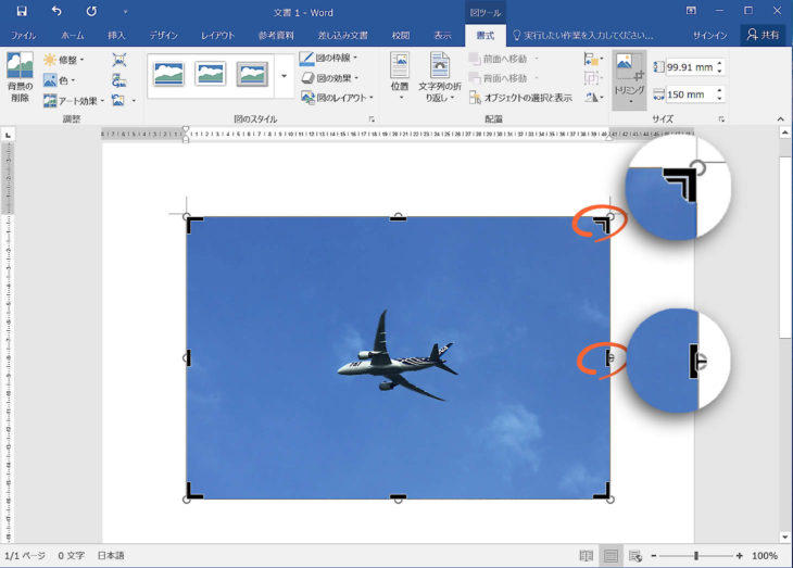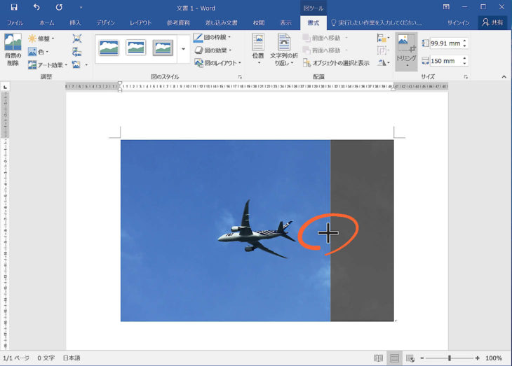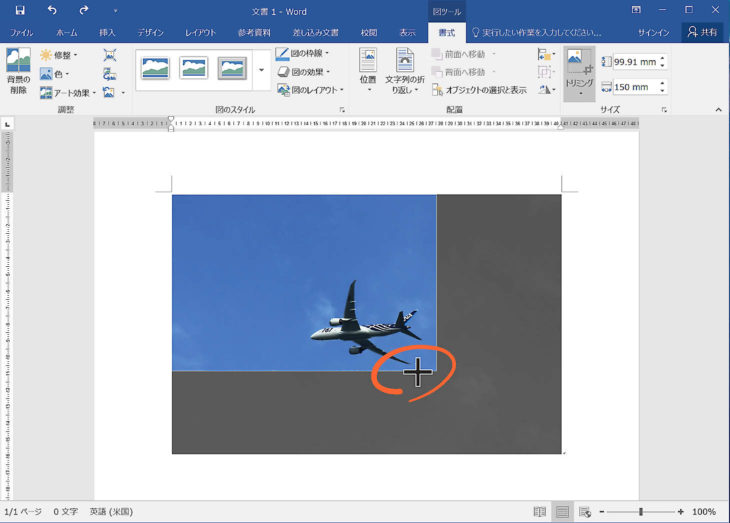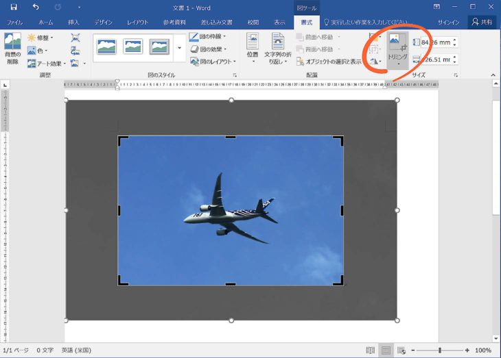 挿入した写真をクリックして、リボンから|図ツール>書式>トリミング>トリミング(C)|と選択します。
