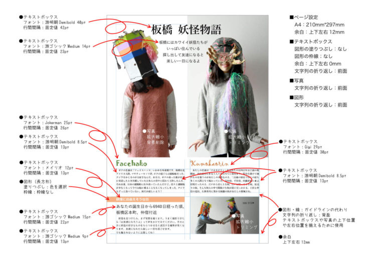 3枚の写真と9個のテキストボックス、1個の図形、補助的なガイドライン代わりに9個の直線を使っています。