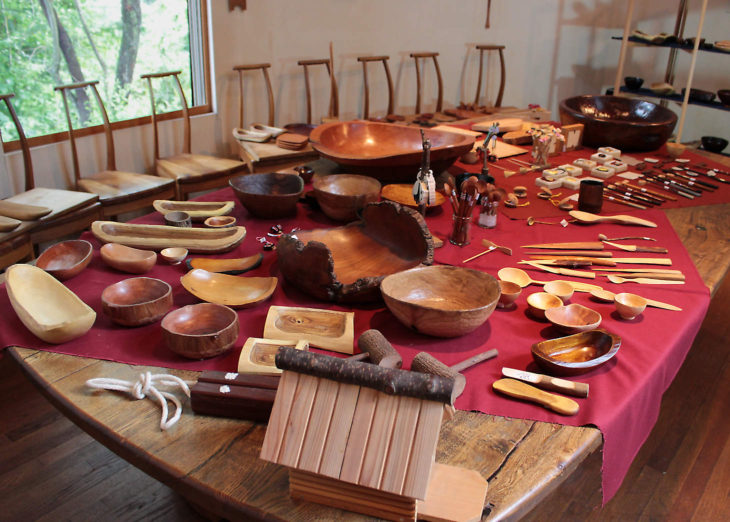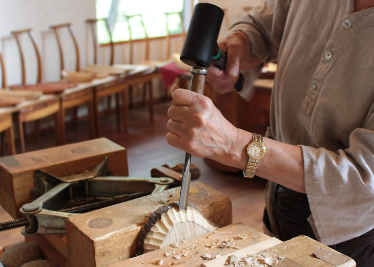 箸づくりの体験コーナー。四角く製材された角材にカンナをかけて先の方を徐々に細くしていきます。手に馴染む形になったら「木固めエース」という塗料を塗って完成です。