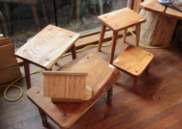 高さが違うスツールと鳥小屋。 素朴な感じの木槌。