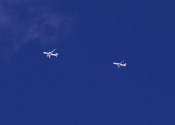 上空を飛ぶ2機の旅客機。地上からの撮影なのでかなり接近しているように見えますが、実際の距離はわかりません。このあと後ろの旅客機が前の旅客機を追い越し違う方角へ飛んで行きました。