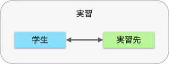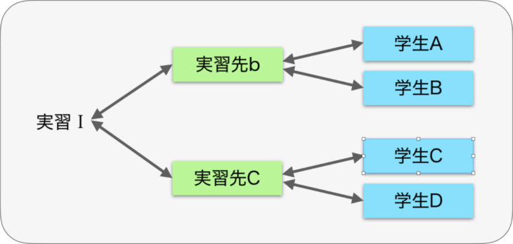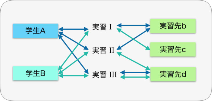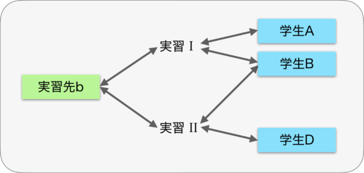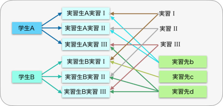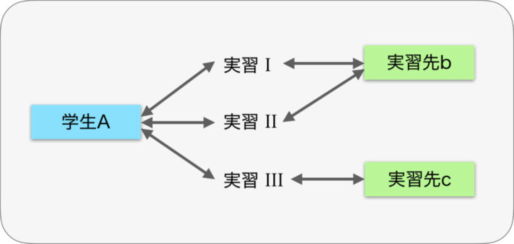 実習という観点から考えると特定の実習では異なる実習先が複数関連付けられ、個々の実習先は複数の学生に関連付けられることになります。