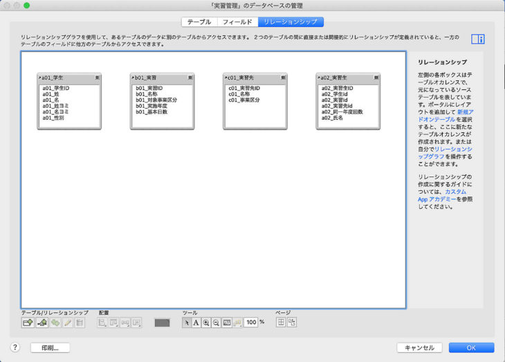 4個のテーブルとフィールドです。ファイルを新規作成するとデフォルトでファイル名と同じテーブルができるのでテーブル名を変更します。私はテーブル名の先頭に記号を入れるようにしています。学生テーブルにはa01_、実習生はa02、実習はb01、実習先はc01というように関係が深いと思われるテーブルには同じアルファベットを使います。フィールド名はテーブル名の記号を先頭に入れることにしています。計算式でフィールドを選択するときにわかりやすくなります。