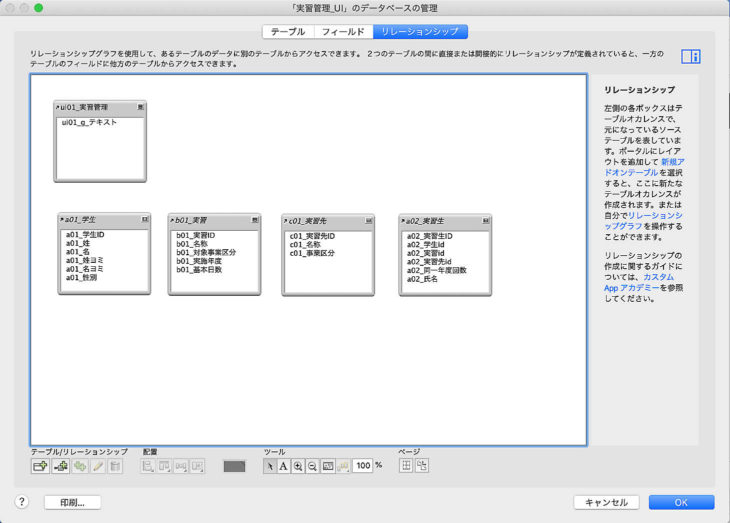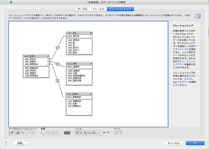 線が複雑に交差しているようですが、学生と実習生は 1:多、実習と実習生は 1:多、実習先と実習生も1:多 になっています。これで何とか関連性を有効にすることができます。