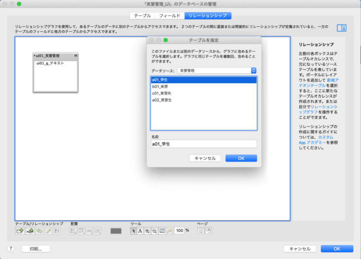 リレーションシップグラフに配置されたテーブルのレイアウトを実習管理_UI上に作成できるようになり、レコード作成やフィールドへの入力が可能になります。実習管理_UIで入力されたデータは実習管理のデータベースで管理されることになります。