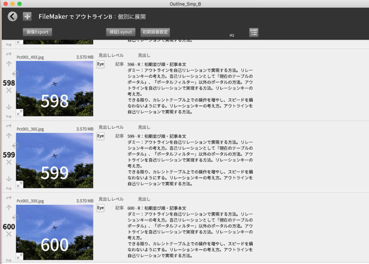 もう一度開いて「画像Export」ボタンをクリックすると600枚の写真が異なるファイル名で「pct_expt」フォルダにエクスポートされます。さすがに時間がかかります。書き出された写真をフォルダ単位でインポートします。「対象レコードの既存のレコードを更新」でインポートすると順番はバラバラですが、600レコードに違うファイル名の写真がインポートされます。これも時間がかかります。FileMakerの容量は3.5MB×600で2GBぐらいと思っていたら、??? 3GB近くになってしまいました。2GBと3GBの差はさて置き、この状態でアウトラインを試して、そのレスポンスを体感してみてください。