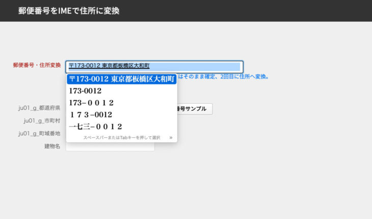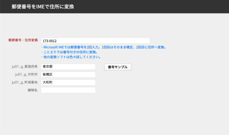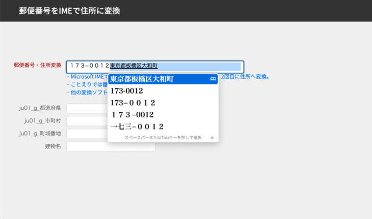 郵便番号を日本語モードの全角で入力するとIMEが住所に変換してくれます。