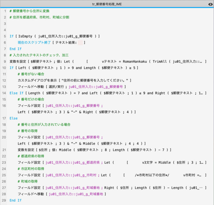 スクリプトで一連の住所を都道府県、市町村、町域名に分割していきます。