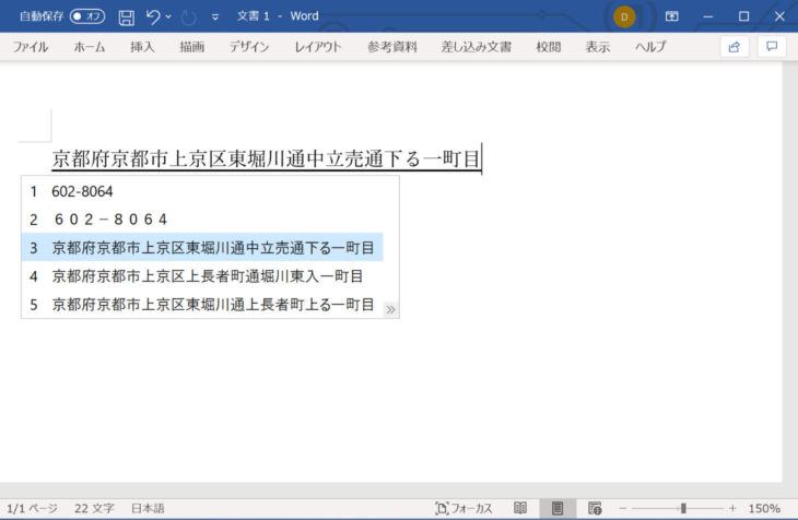 Windowsの変換候補には3件とも表示されますが、Macでは通り名がない「上京区一丁目」だけの1件しか表示されません。