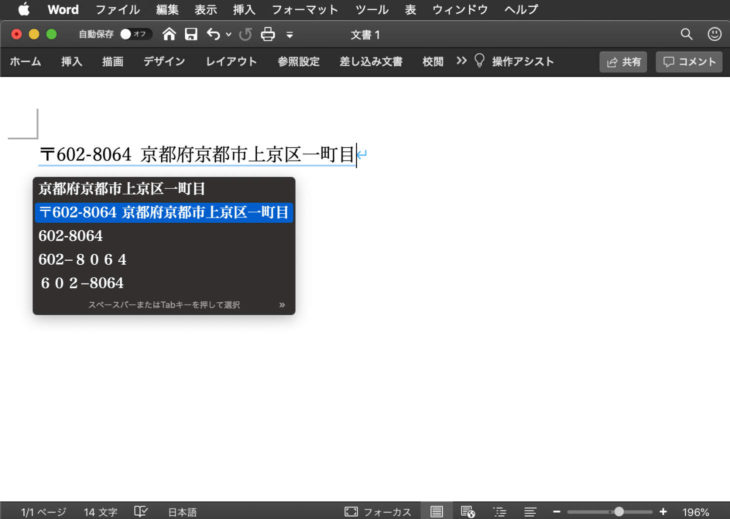 Mac標準の日本語入力ソースでは「〒000-0000東京都・・・」、「東京都・・・」、「000-0000」と番号付き住所、住所のみ、番号のみと変換候補が現れます。